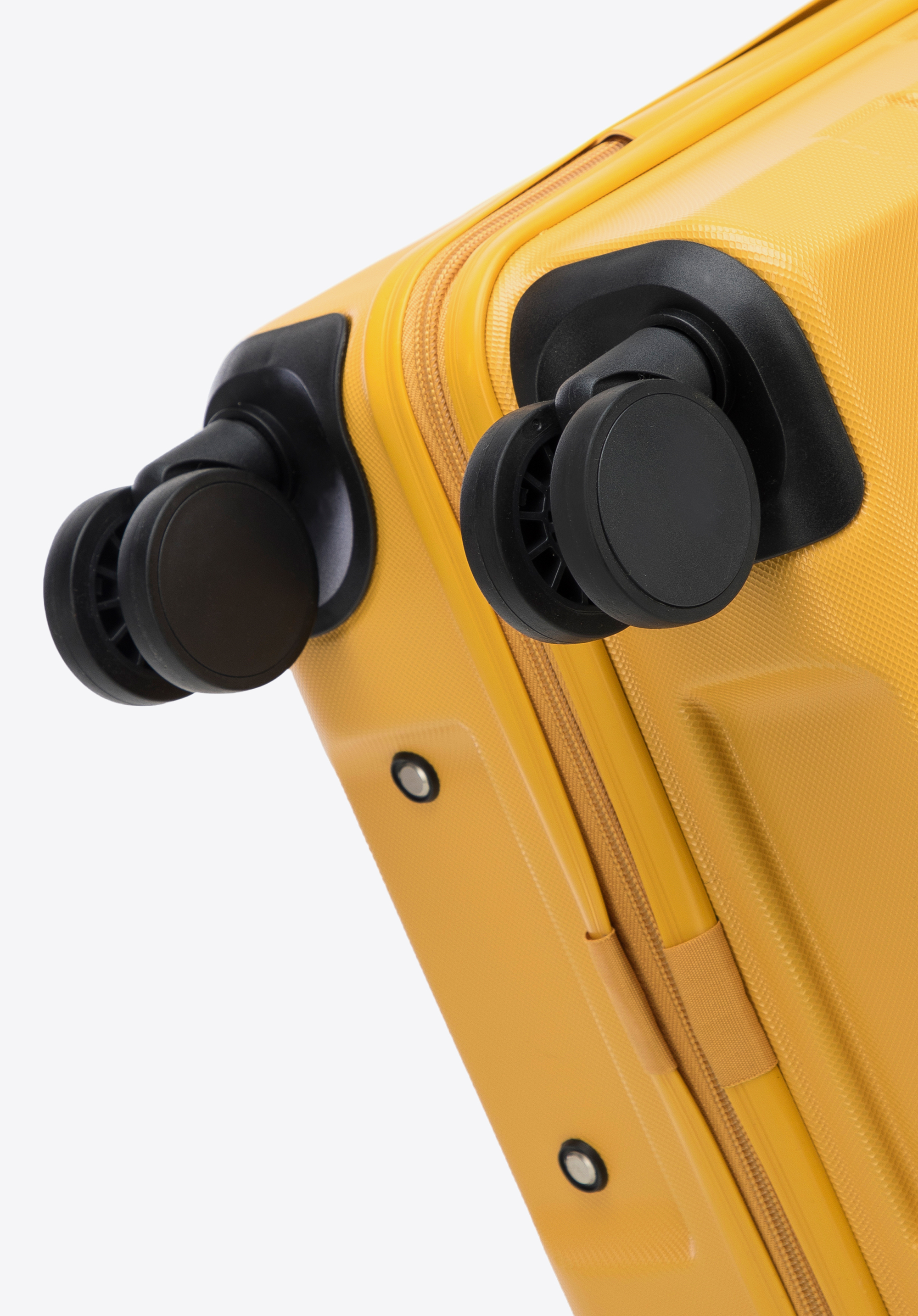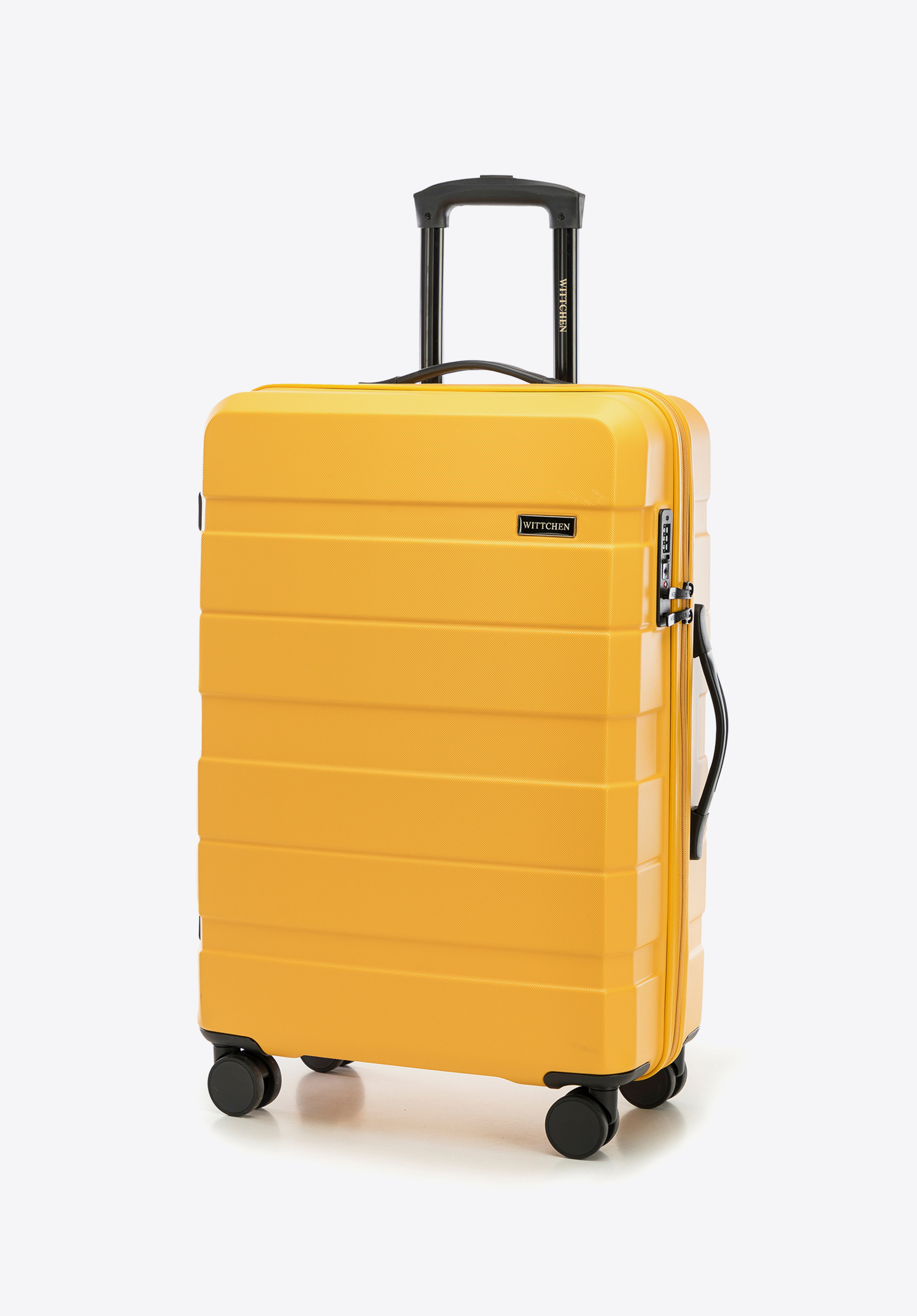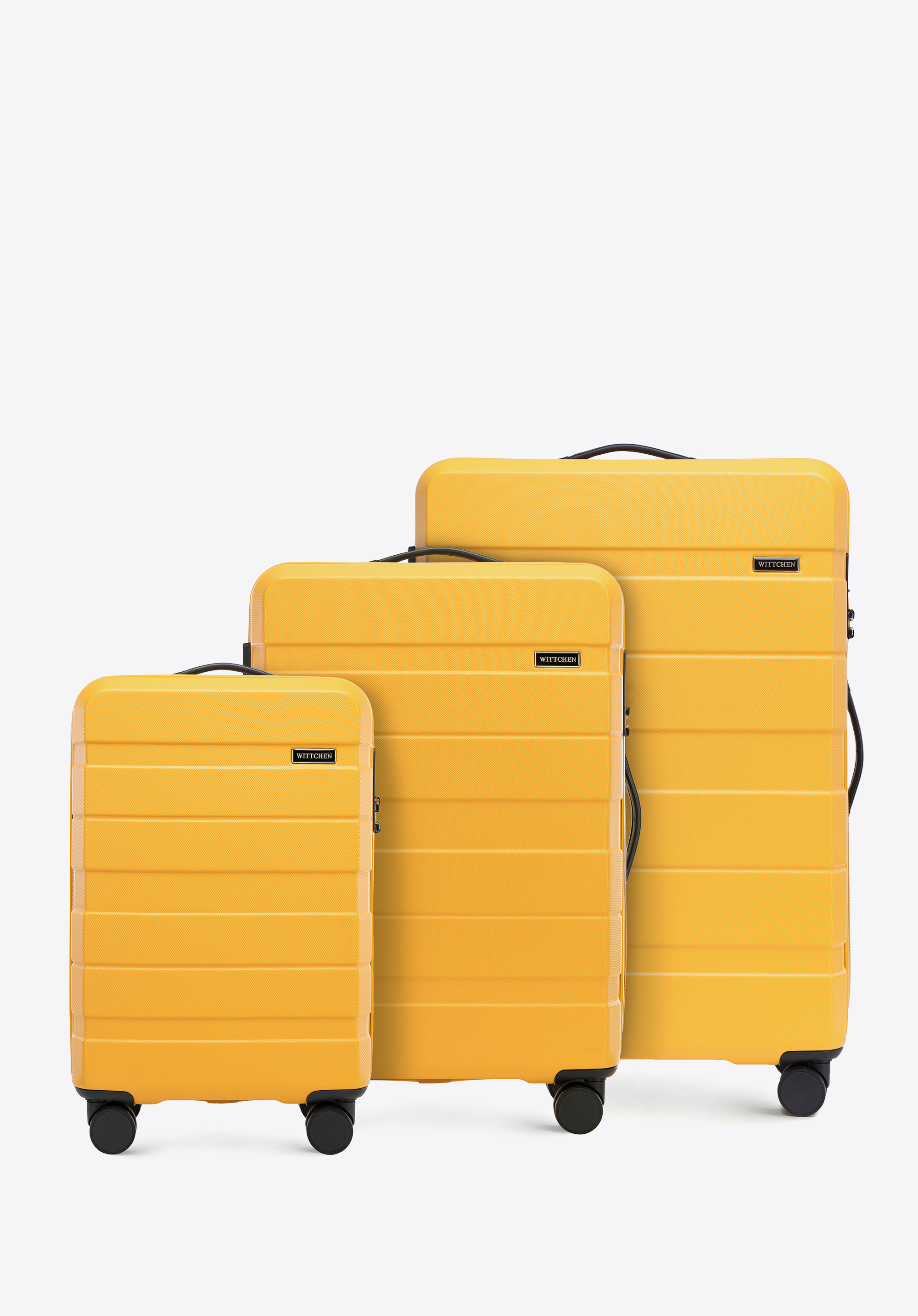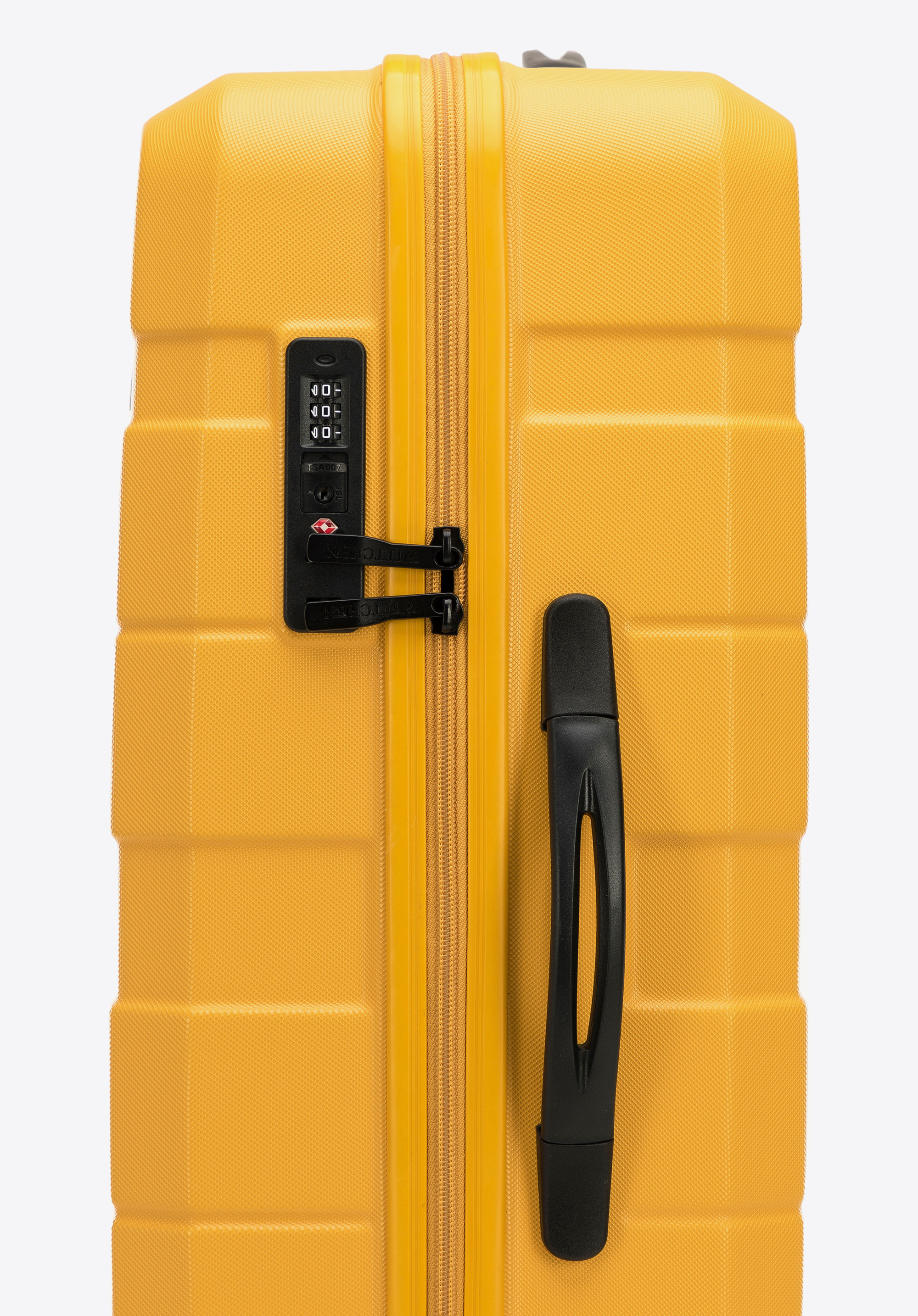 Zestaw składa się z trzech walizek: małej, średniej i dużej. Każda wyposażona w cztery podwójne kółka oraz wysuwaną teleskopową rączkę, co zapewnia płynność i łatwość manewrowania, niezależnie od obciążenia. Ergonomiczne rączki, wykonane z gumy, zapewniają komfort podczas przenoszenia, a poziome pasy nadają walizkom nowoczesny wygląd. Dodatkowe zabezpieczenie w postaci zamka szyfrowego chroni przed niepożądanym dostępem do wnętrza.