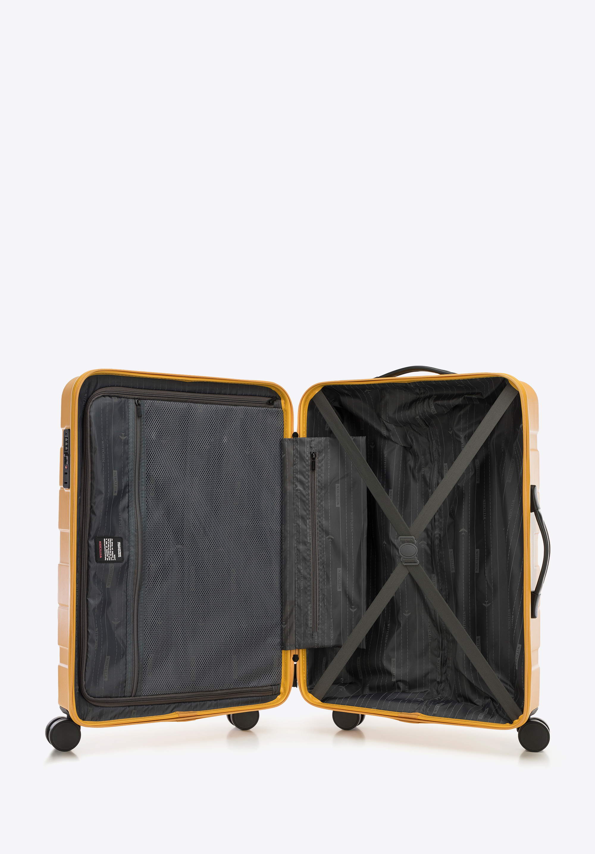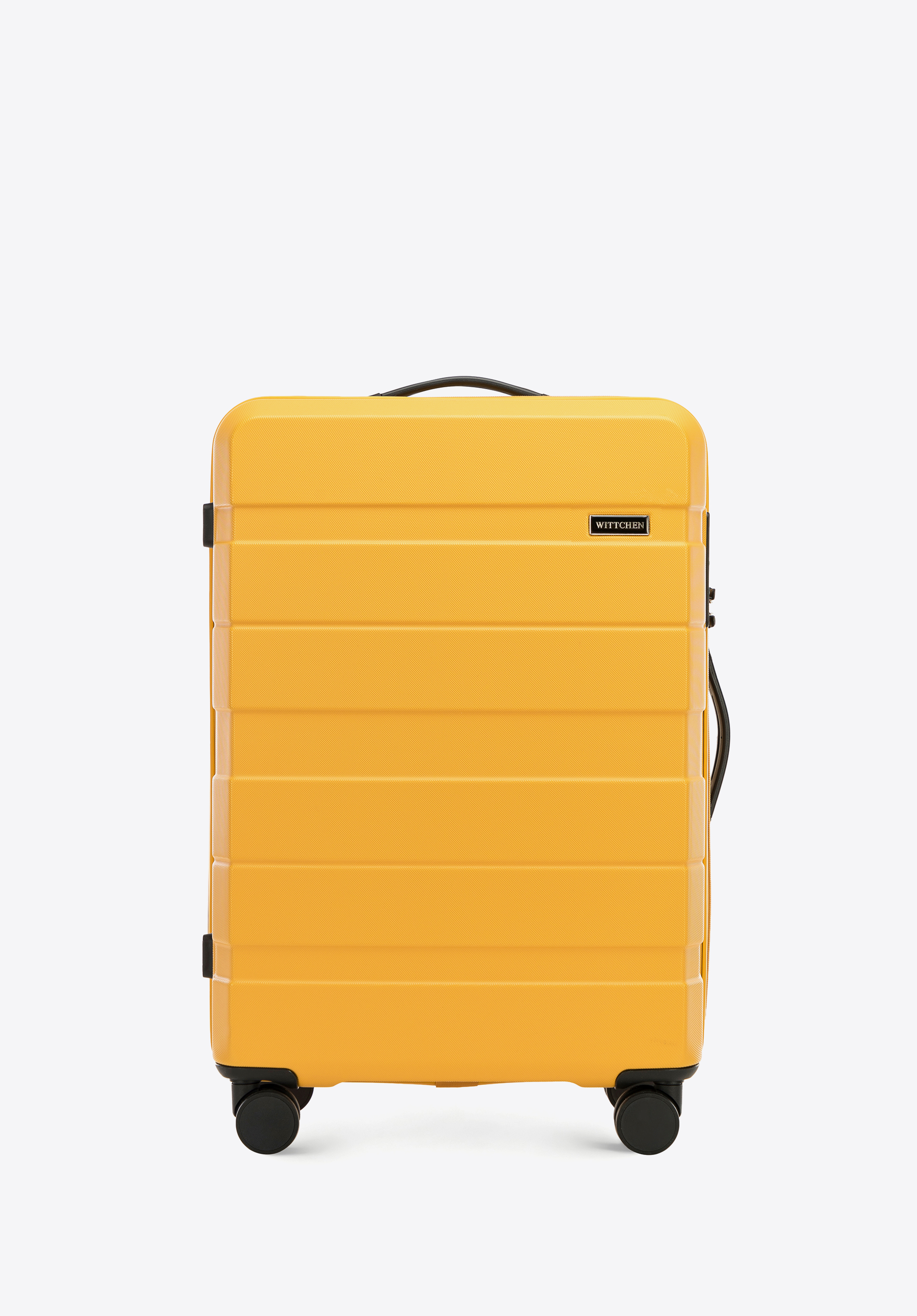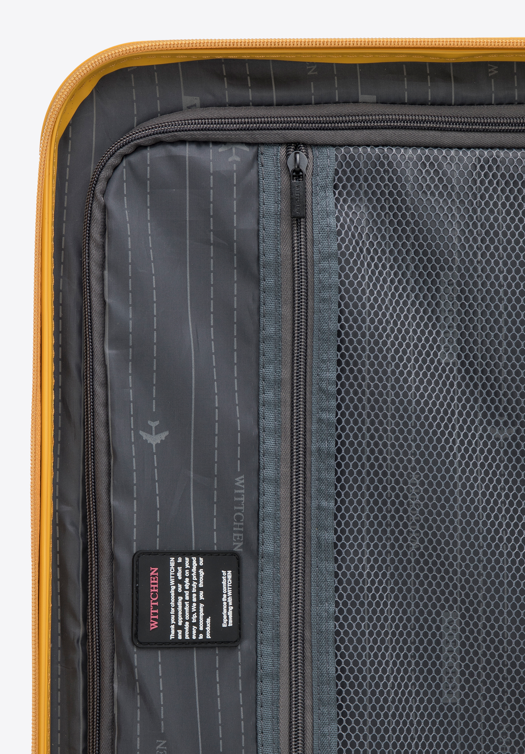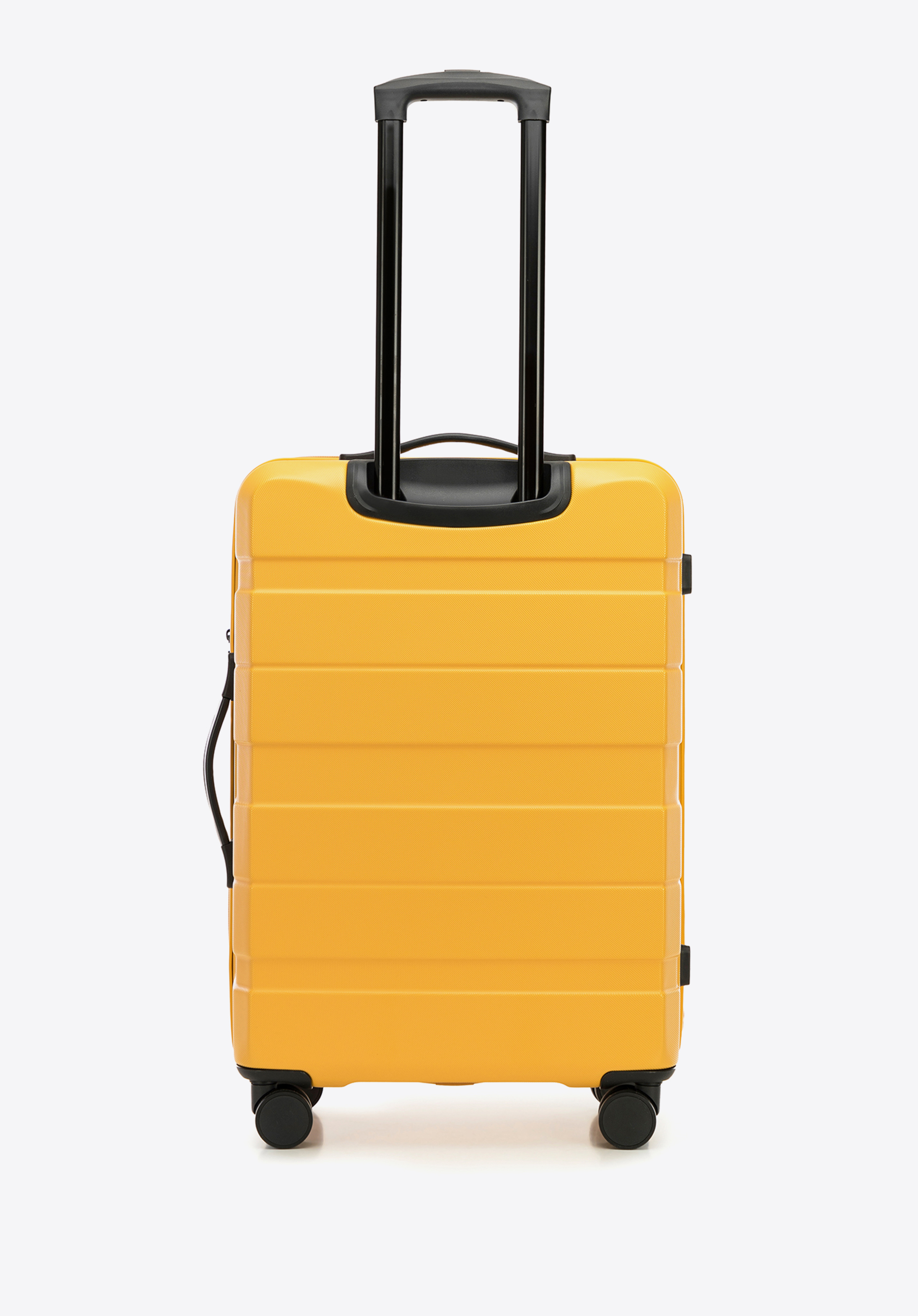 Zestaw składa się z trzech walizek: małej, średniej i dużej. Każda wyposażona w cztery podwójne kółka oraz wysuwaną teleskopową rączkę, co zapewnia płynność i łatwość manewrowania, niezależnie od obciążenia. Ergonomiczne rączki, wykonane z gumy, zapewniają komfort podczas przenoszenia, a poziome pasy nadają walizkom nowoczesny wygląd. Dodatkowe zabezpieczenie w postaci zamka szyfrowego chroni przed niepożądanym dostępem do wnętrza.