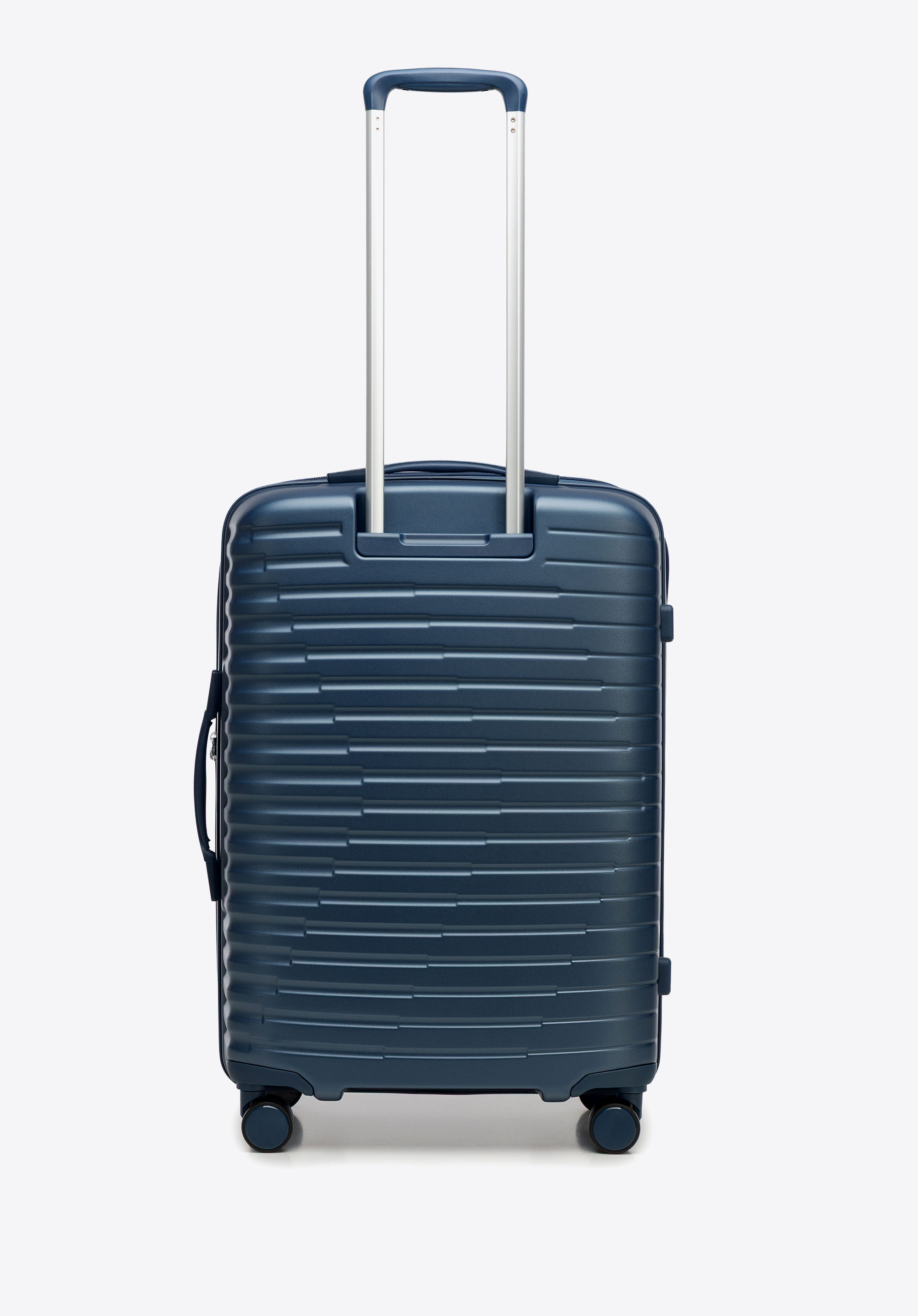 - Komfort prowadzenia: Teleskopowe rączki stalowo-aluminiowe z logo oraz gumowe uchwyty — górne we wszystkich modelach, dodatkowo boczne w średniej i dużej walizce — ułatwiają manewrowanie i przenoszenie bagażu.