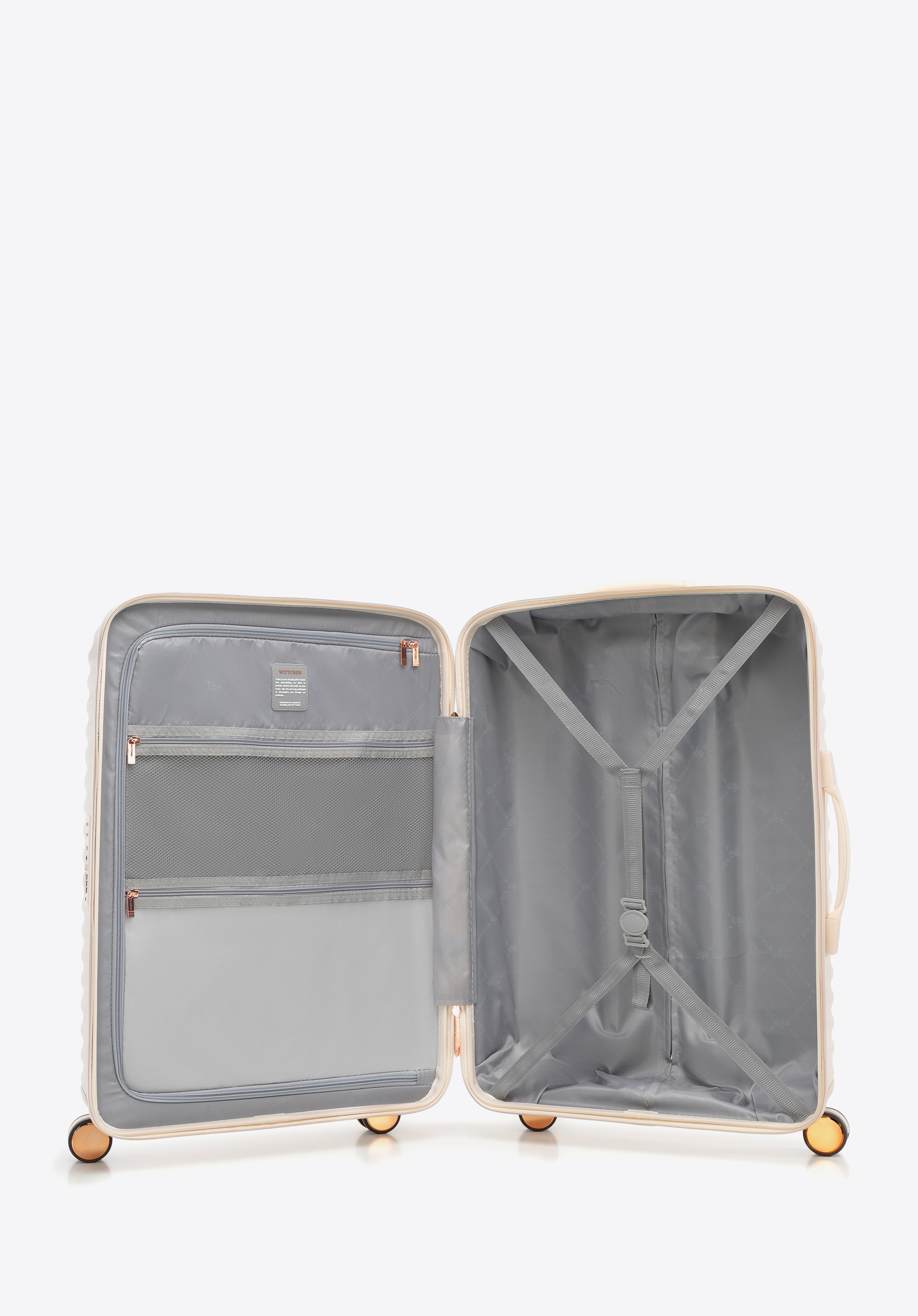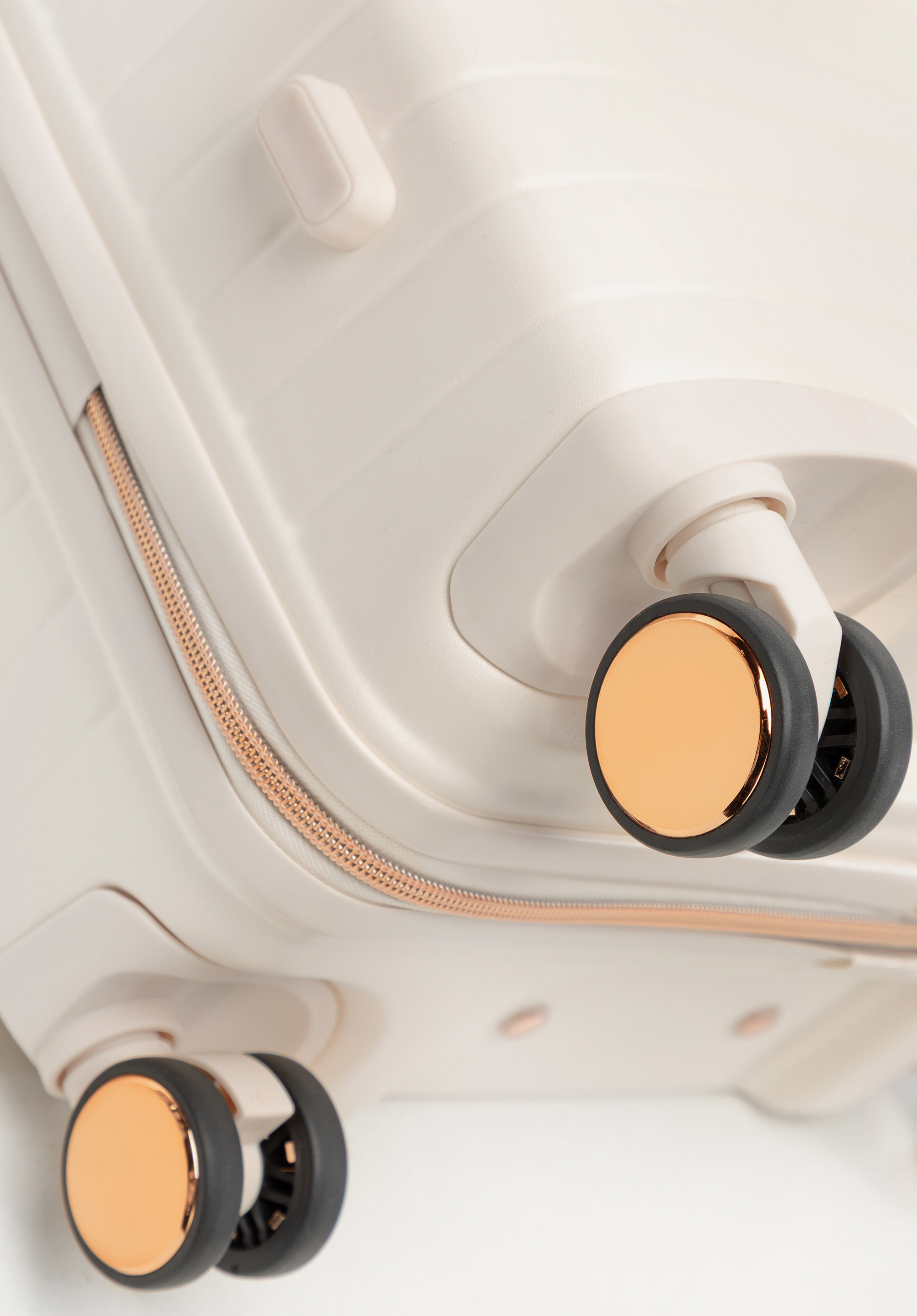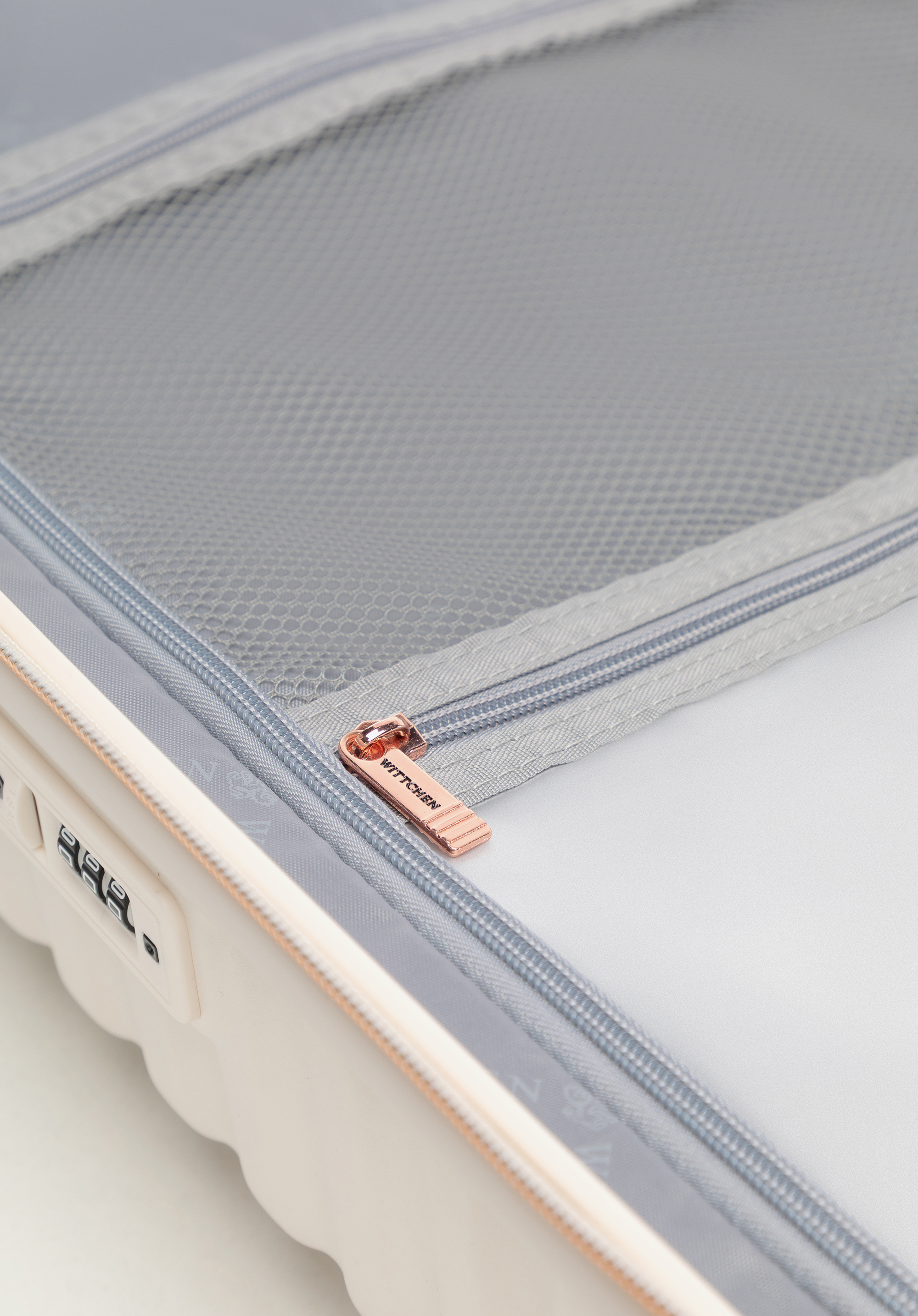 - Stabilność: 4 boczne nóżki w średniej i dużej walizce zapewniają stabilne i bezpieczne ustawienie bagażu na boku.