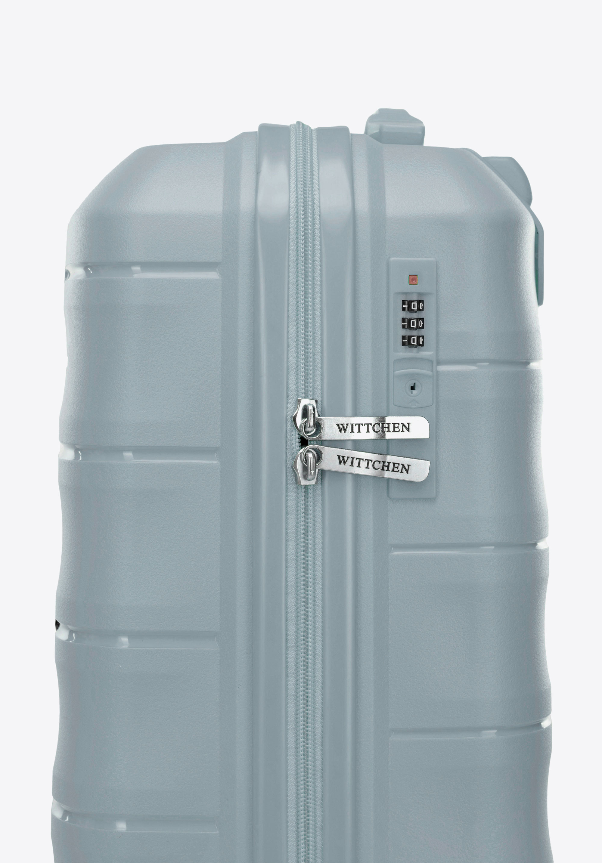 - Estetyka: Poziome, błyszczące tłoczenia przyciągają uwagę. Dodatkowo w każdym kolorze walizki, dopasowaliśmy taśmę suwaka do skorupy tworząc jednolitą, miłą dla oka bryłę.