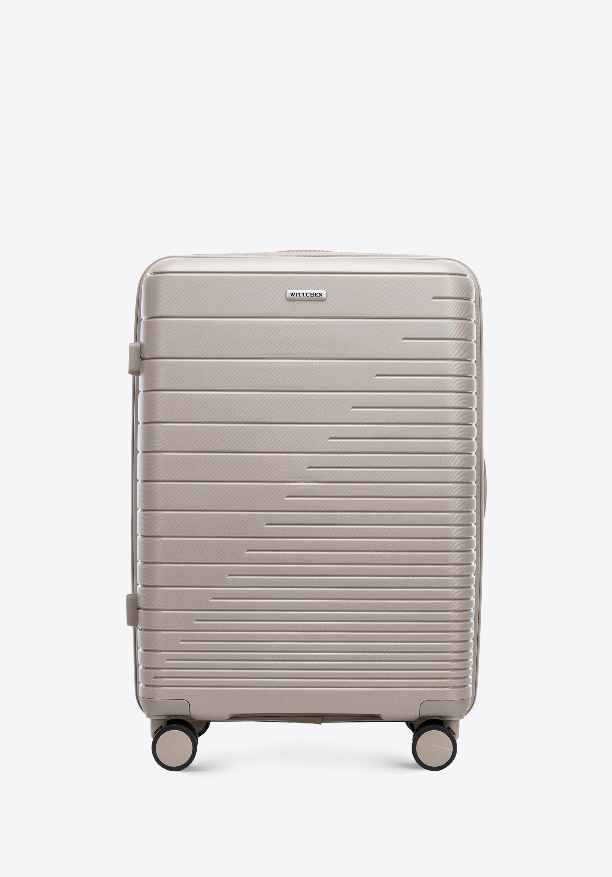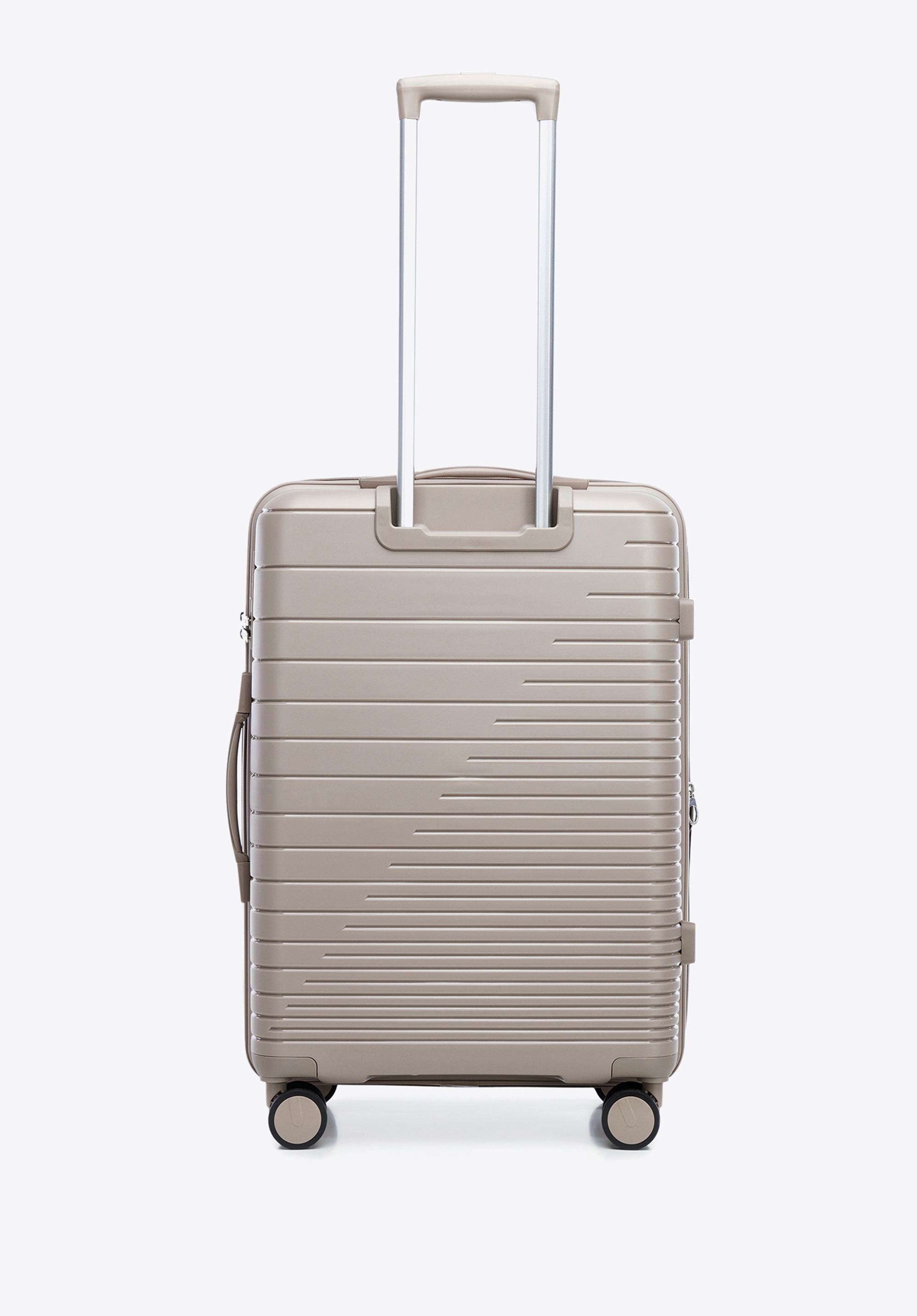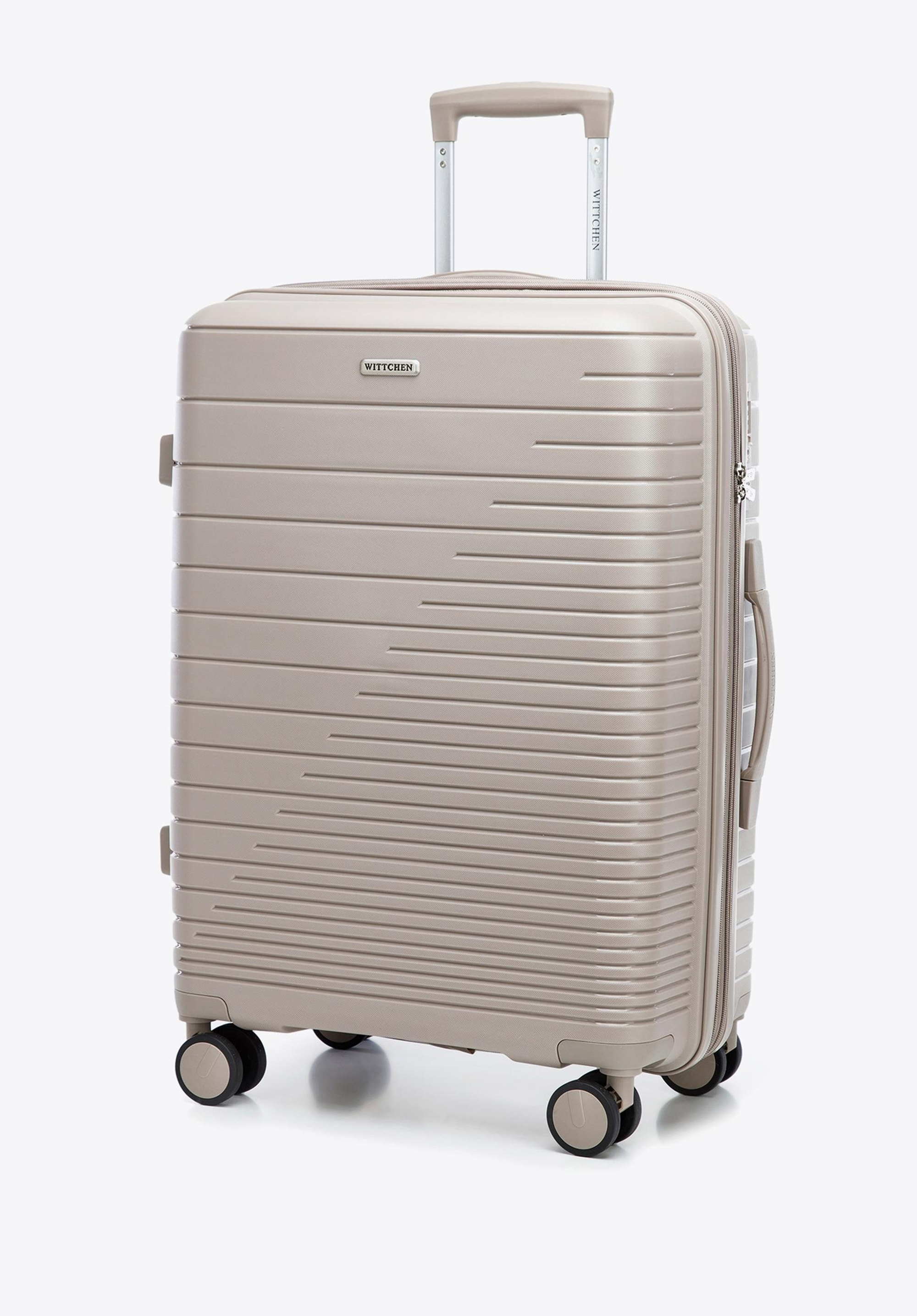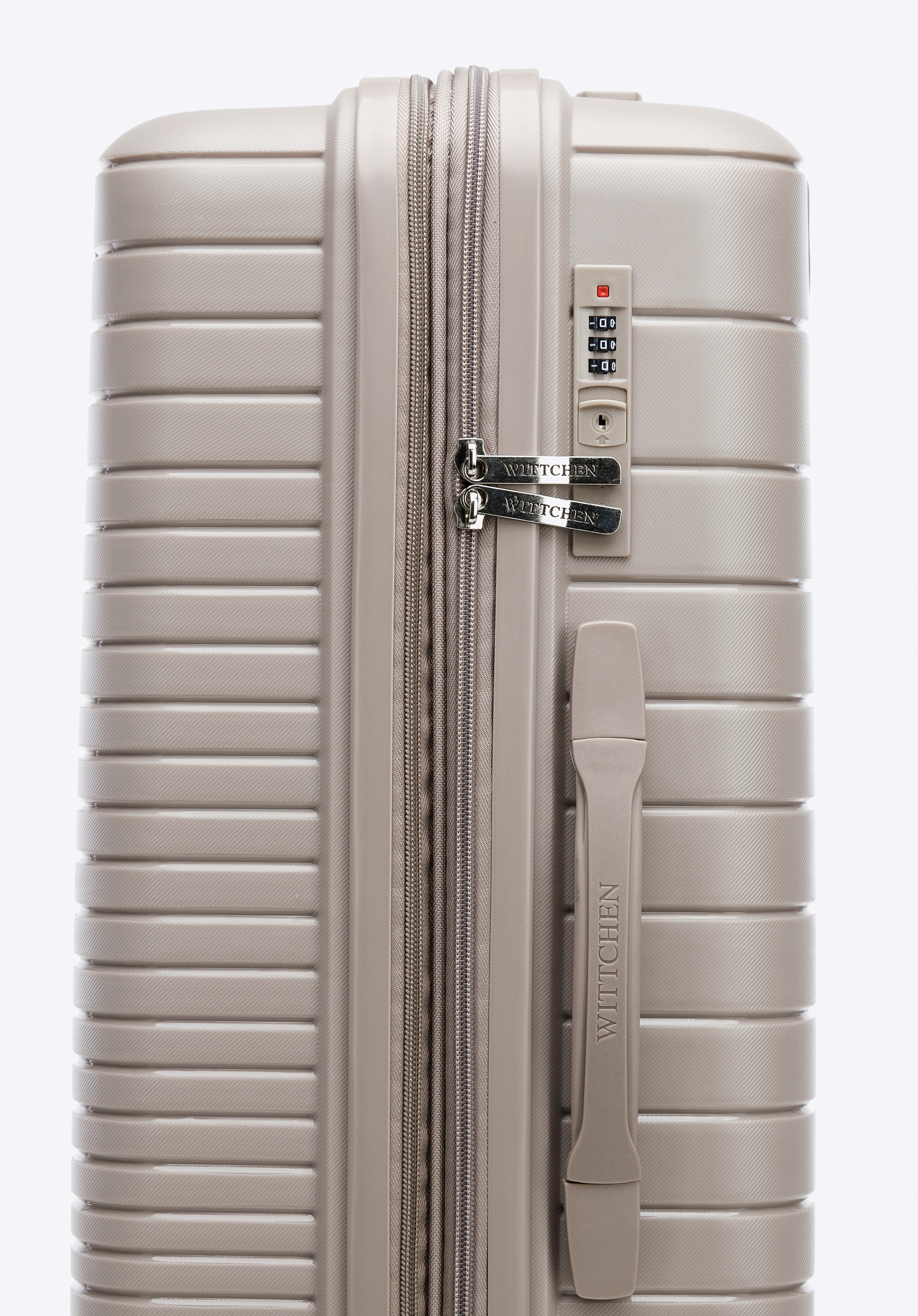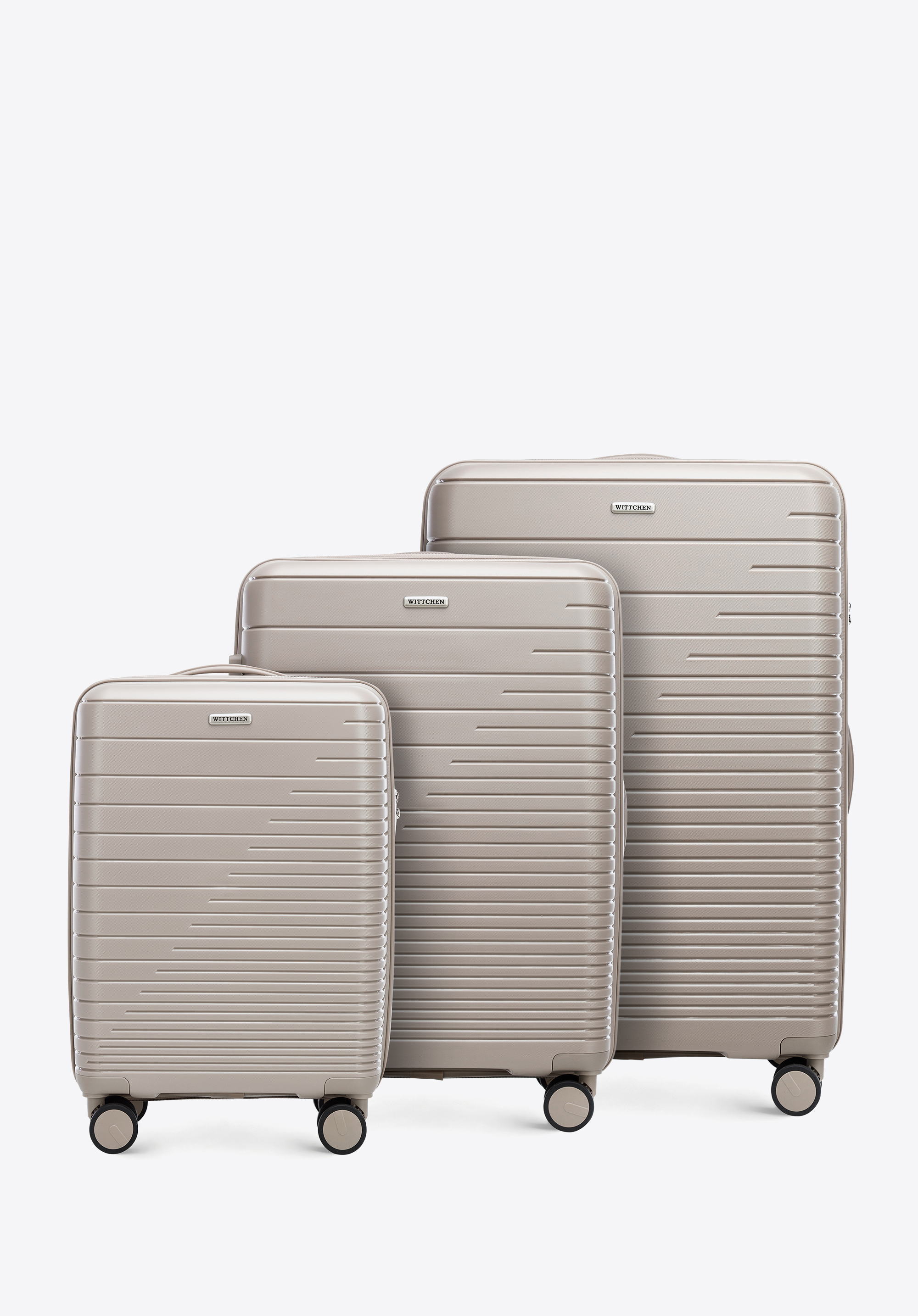 wysuwanej, teleskopowej rączce i czterem podwójnym obrotowym kółkom wygodnie będzie je prowadzić. Zestaw walizek z polipropylenu z błyszczącymi paskami to świetny wybór na każdy wyjazd.